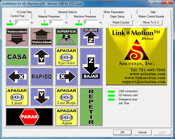 - Preset but expandable materials menu, positioning of a job, keyboard controls for axis moves, handling of the home position sensors, flexible start position, acceleration/deceleration setup and control, maximum step rate 125,000, 6 inputs, and 8 outputs are all part of the package.